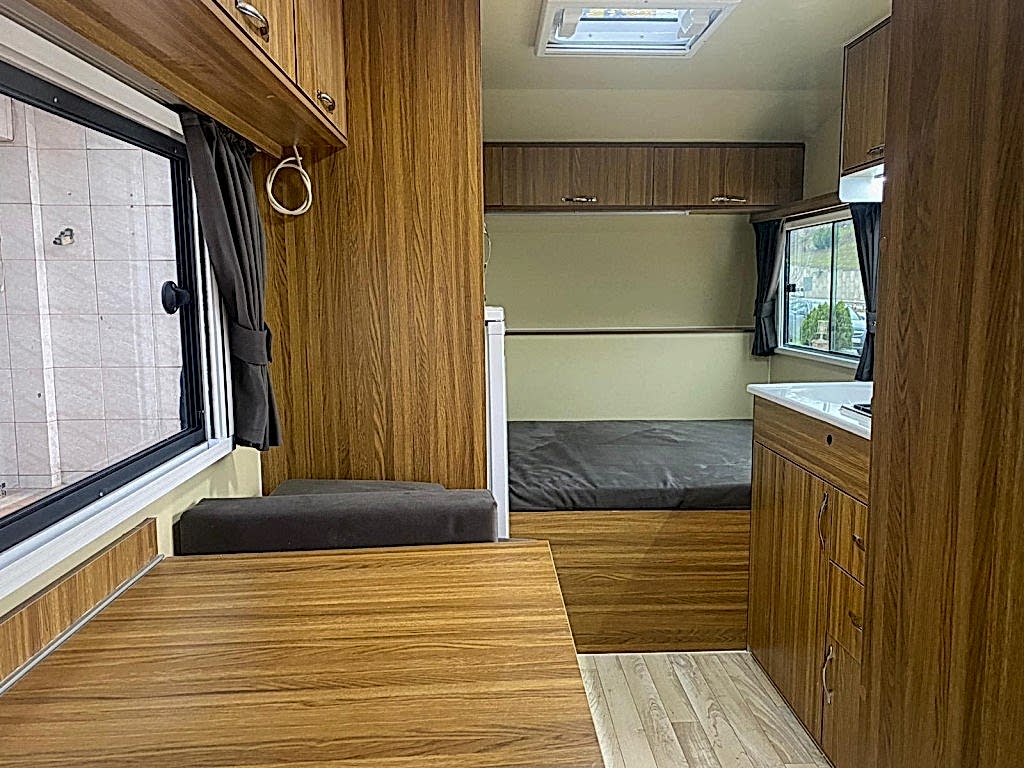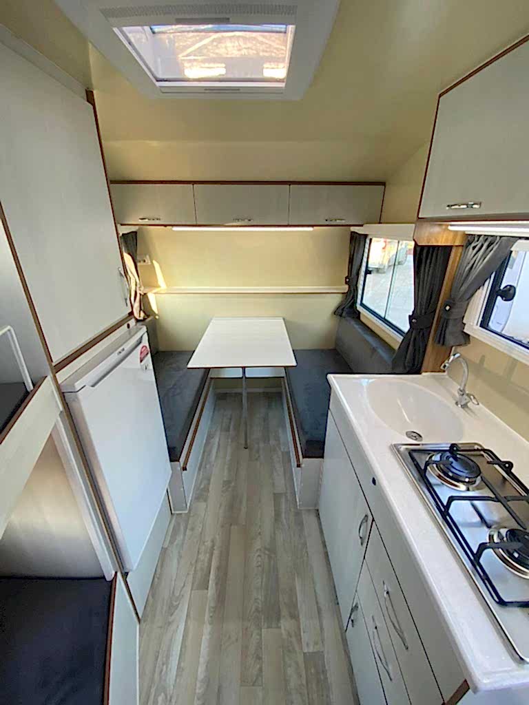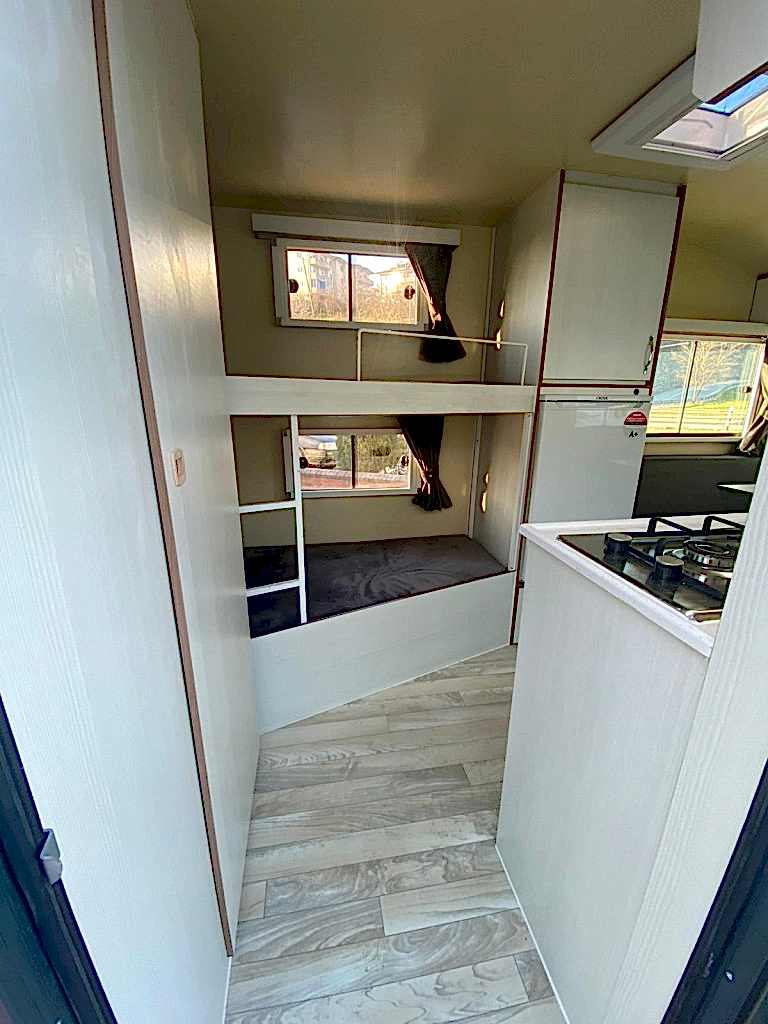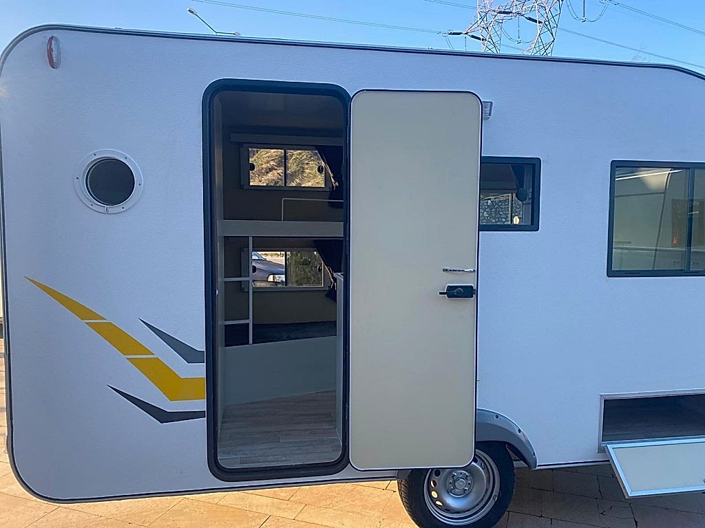 Karavanın alt tabanı ise , 35 mm kalınlığında çelik ve ahşap iskeletli üst yüzeyi 6 mm kavak kontrplak alt yüzeyi yekpare fiberglas tecrit dolgu malzemesi olarak 30 dansite strafor ve özel yapıştırıcısı ile preslenerek elde edilen sandviç panellerden imal edilip üst yüzeyi PVC gerflor ile kaplanmıştır karavanın tüm mobilyaları uzun ömürlü 0.5 mm laminat kaplı 13 mm kavak kontrplak olup desen ve renk seçebilirsiniz 2 kişilik 130 x 190 cm ölçülerinde yatak olan masalı oturma grubu 2 adet sabit ranza 220 volt kompresörlü buzdolabı, mutfak, domino ocak duş, lavabo, gardrop, kimyasal WC, 120 LT su deposu, genleşme tanklı 12 volt otomatik yat hidroforu, 12 volt 150 amper bakımsız akü , 400 vat mono kristal güneş paneli , MPPT şarj kontrol cihazı12 - 220 1000 vat şarjlı otomatik inverter , 12 volt LED aydınlatma armatürler , 12 volt ve 220 volt prizler monteli çalışır durumda teslim edilecektir .Bu karavanımız da kendine yetecek kadar enerji üretebilmektedir.