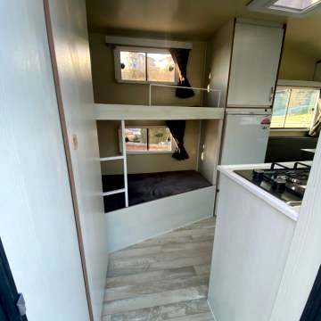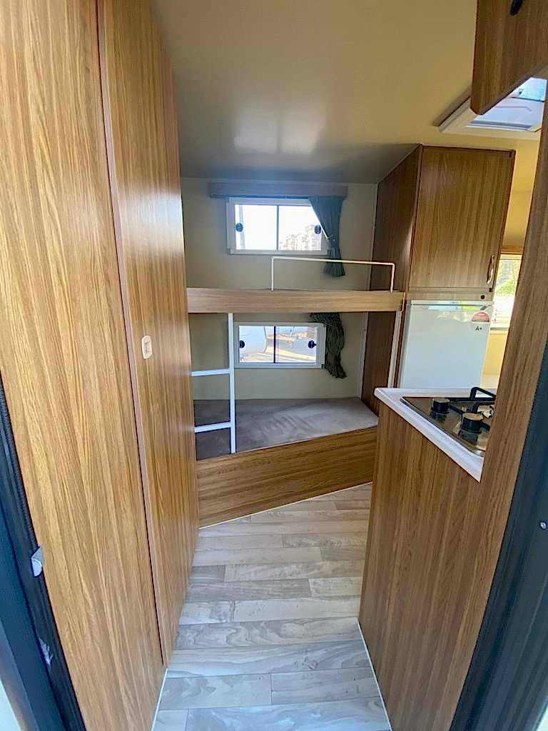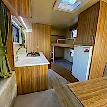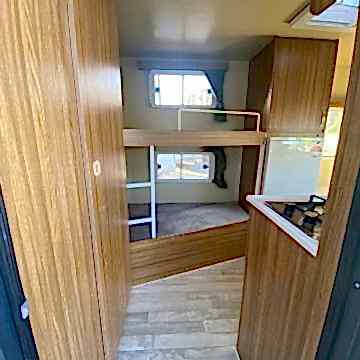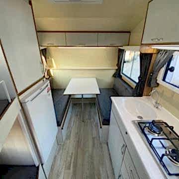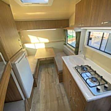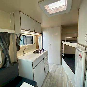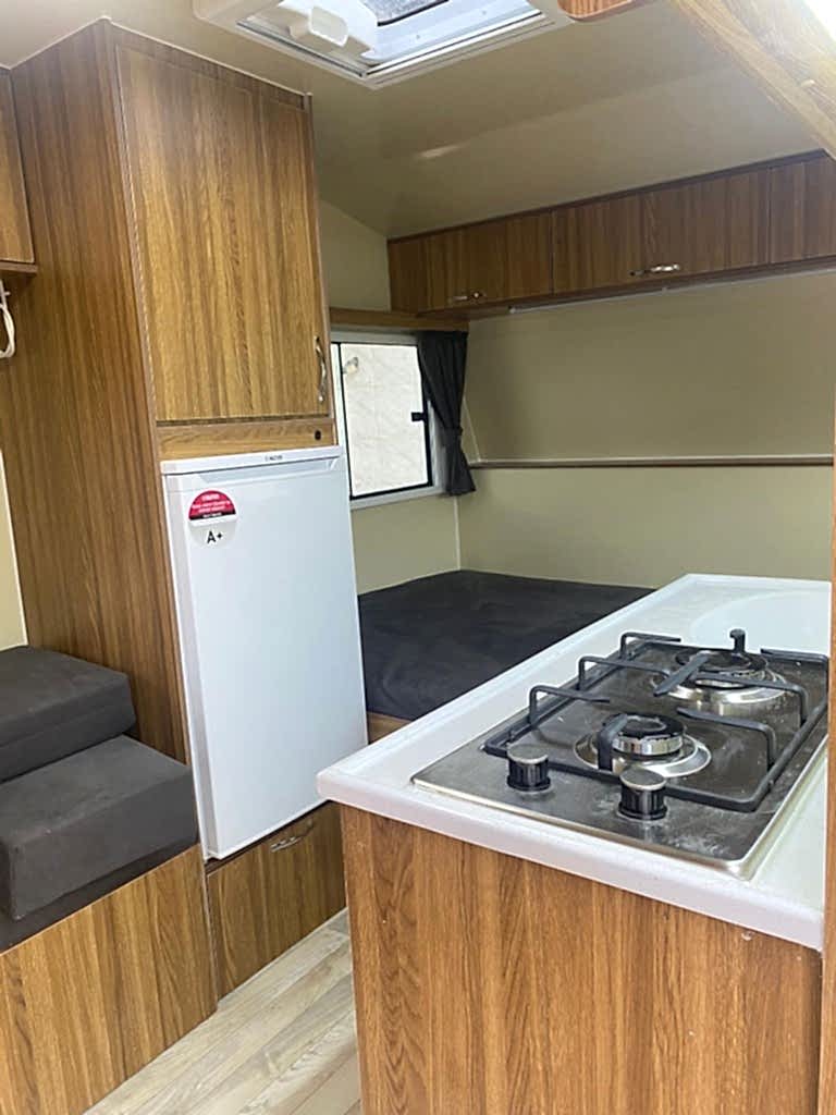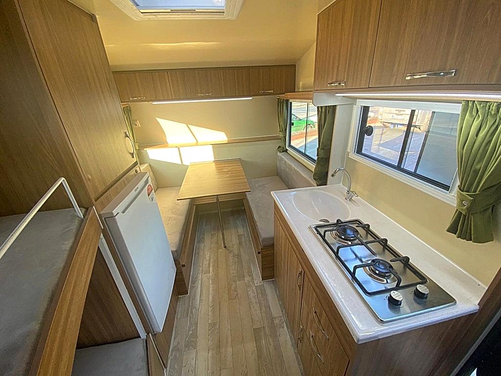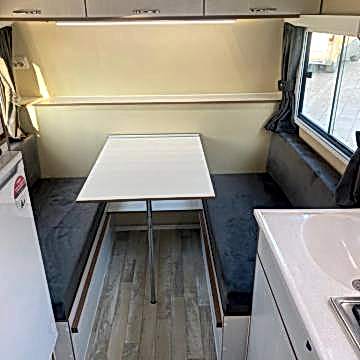 Karavanın alt tabanı ise , 35 mm kalınlığında çelik ve ahşap iskeletli üst yüzeyi 6 mm kavak kontrplak alt yüzeyi yekpare fiberglas tecrit dolgu malzemesi olarak 30 dansite strafor ve özel yapıştırıcısı ile preslenerek elde edilen sandviç panellerden imal edilip üst yüzeyi PVC gerflor ile kaplanmıştır karavanın tüm mobilyaları uzun ömürlü 0.5 mm laminat kaplı 13 mm kavak kontrplak olup desen ve renk seçebilirsiniz 2 kişilik 130 x 190 cm ölçülerinde yatak olan masalı oturma grubu 2 adet sabit ranza 220 volt kompresörlü buzdolabı, mutfak, domino ocak duş, lavabo, gardrop, kimyasal WC, 120 LT su deposu, genleşme tanklı 12 volt otomatik yat hidroforu, 12 volt 150 amper bakımsız akü , 400 vat mono kristal güneş paneli , MPPT şarj kontrol cihazı12 - 220 1000 vat şarjlı otomatik inverter , 12 volt LED aydınlatma armatürler , 12 volt ve 220 volt prizler monteli çalışır durumda teslim edilecektir .Bu karavanımız da kendine yetecek kadar enerji üretebilmektedir.